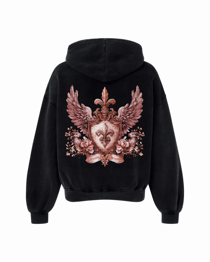 From the front, this hoodie looks almost quiet: a small Bird resting above the word Chakor, placed over the heart. It is a reminder that you don’t have to shout to know your own worth. Turn around and the piece stops being minimal and becomes a full story—a winged crest, roses in bloom, and a banner that reads “Guided by Moon.”