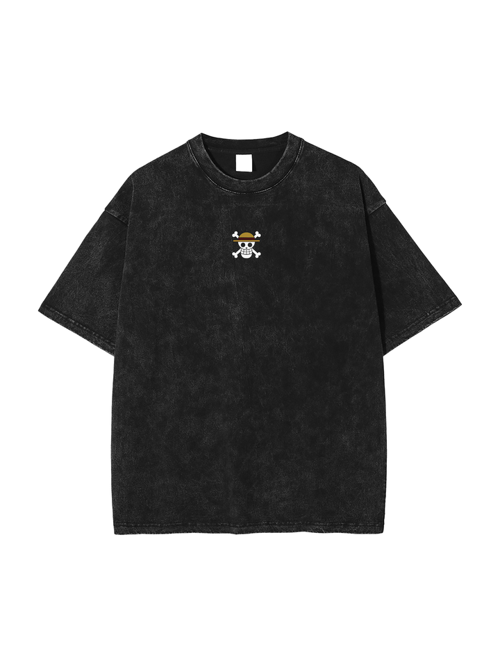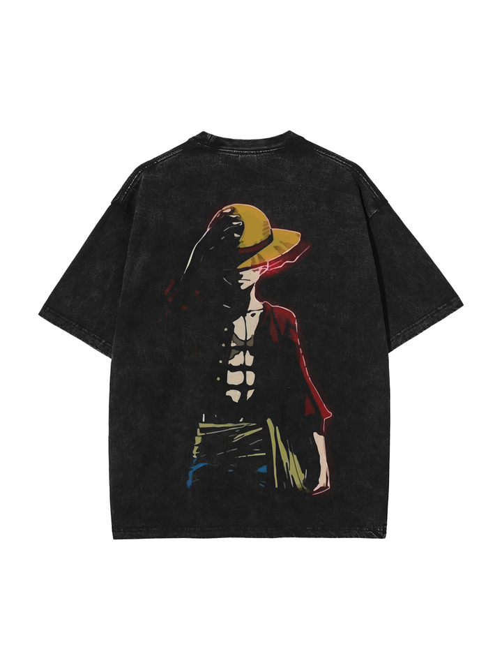 This shirt features a minimalist front with the iconic Straw Hat Jolly Roger emblem and a powerful back illustration of Luffy, shadowed and stylized, tipping his straw hat with quiet confidence. The muted color palette on a vintage black base gives this tee a washed, battle-worn aesthetic—perfect for those who see life as an endless voyage.