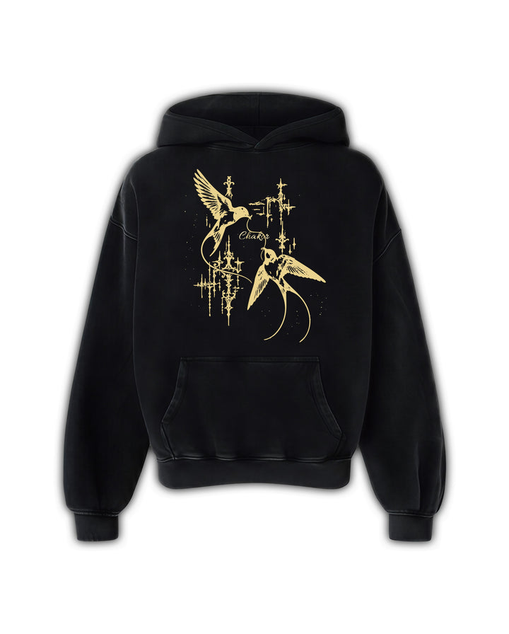 The artwork sits on a snow-washed black hoodie made from 100% cotton fleece at a heavy 400 GSM, built to feel like a proper winter shell. It has real weight on the shoulders, a soft brushed interior for warmth, a relaxed streetwear fit and a deep kangaroo pocket for cold hands and small essentials. The gold print pops against the washed black like light against night sky, making Oiseaux a quiet statement piece—simple at a distance, full of meaning up close.