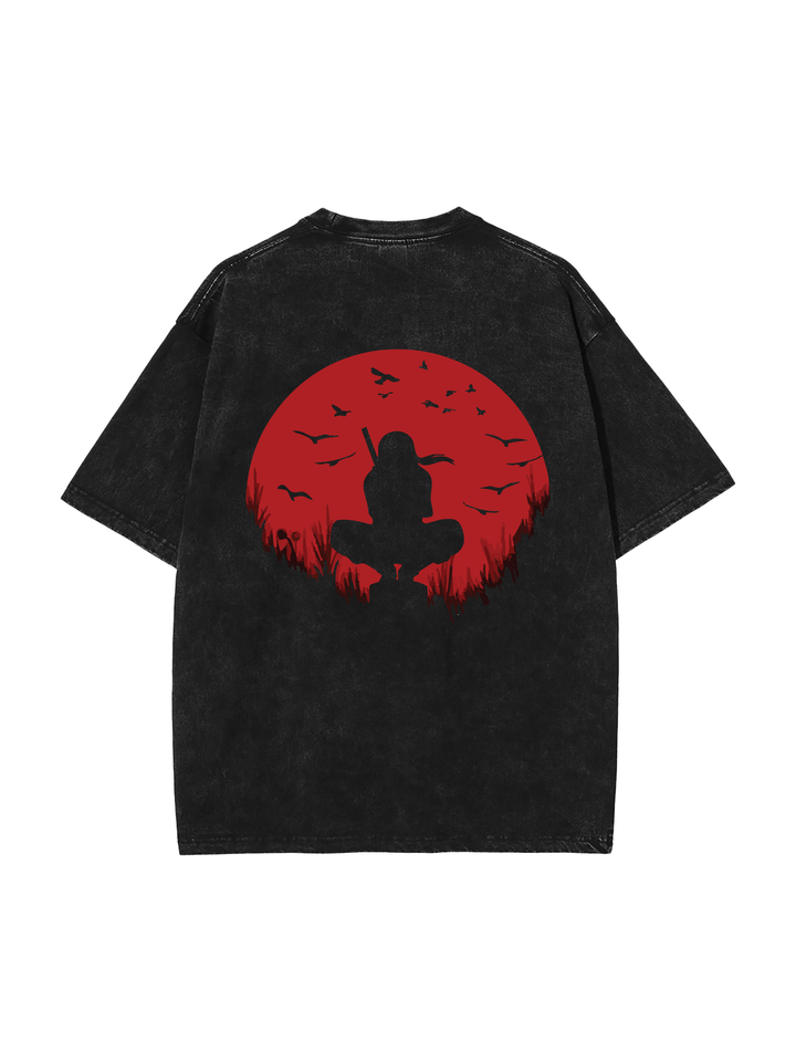 On the front, a minimalist red serpent coiled around a kunai symbolizes inner conflict and power. On the back, a silhouette of a shinobi crouched in a field of blades, set against a blood-red moon, captures a moment of stillness before chaos—a visual metaphor of patience, precision, and pain.