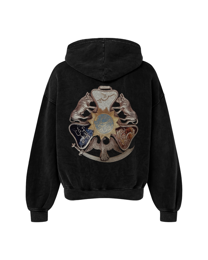 All of this is carried on a snow-washed black hoodie crafted from 100% cotton fleece at a substantial 400 GSM. The fabric has real presence—heavy enough for winter, softly brushed on the inside for warmth, with a washed finish that gives the garment the calm, lived-in character of something archival rather than disposable. The relaxed silhouette, kangaroo pocket and ribbed cuffs and hem keep it firmly in the realm of everyday streetwear, but Wali-e-Punjab wears more like a piece of history you chose to put on.
